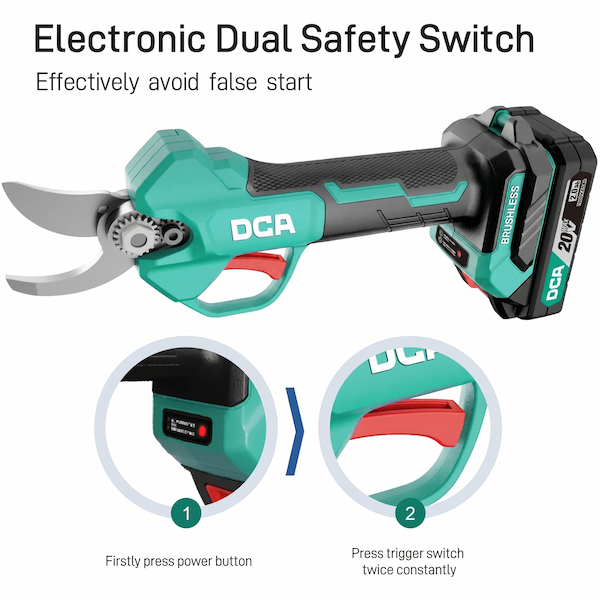 تحتل سلامة المشغل أولوية قصوى في تصميم هذا المقص، حيث يدمج نظام أمان مزدوج يتطلب الضغط السريع على الزناد 3 مرات متتالية لفك القفل، مما يمنع التشغيل العرضي تماماً في الميدان. كما توفر ميزة الإيقاف التلقائي حماية إضافية بإغلاق الأداة بعد 10 دقائق من عدم الاستخدام. وبفضل طقم الطاقة المرفق الذي يضم بطاريتين ليثيوم أيون بسعة 2 أمبير وغمد حماية محمول، يضمن المستخدم أداءً متواصلاً وموثوقاً بين الأشجار دون أي توقف أو انقطاع مفاجئ للعمل.