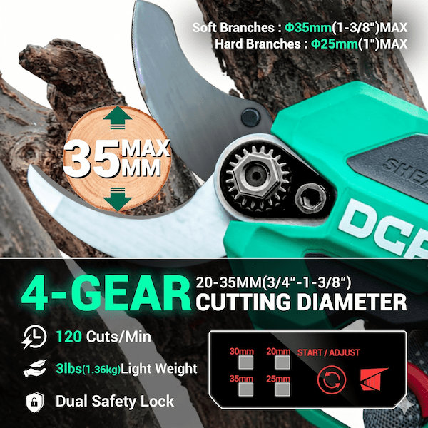 • قدرة قص عالية: يتعامل بسهولة مع الفروع اللينة حتى قطر 35 ملم والفروع الصلبة حتى قطر 25 ملم في أعلى مستوى للترس.