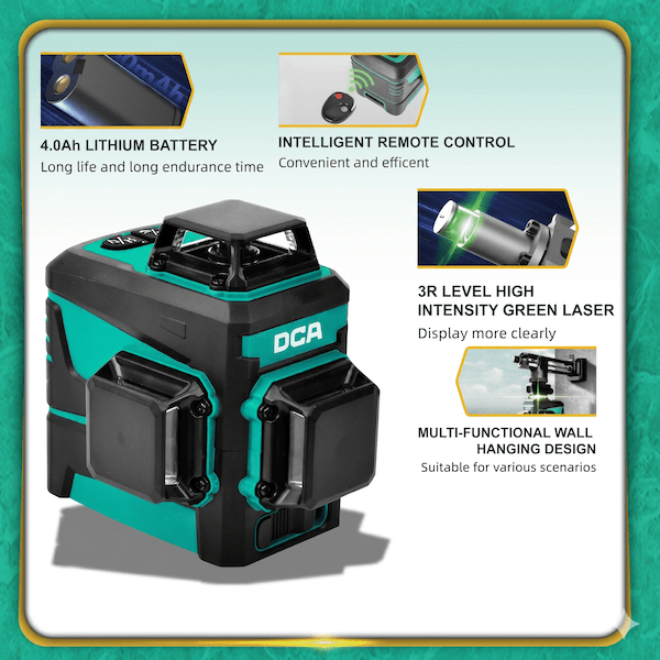 يجمع ميزان ليزر دي سي اي AFF12LE بين دقة القياس المتناهية والتكنولوجيا الذكية لضمان محاذاة خالية من العيوب في مشاريع البناء، والنجارة، والتصميم الداخلي. يعتمد هذا الجهاز على ليزر أخضر فئة 3R (515 نانومتر) عالي الكثافة، ليقوم بإسقاط خطوط أفقية وعمودية ساطعة وواضحة تماماً حتى في بيئات العمل جيدة الإضاءة. وبفضل تزويده بـ بطارية ليثيوم بسعة 4 أمبير قابلة للشحن، فإنه يوفر أوقات تشغيل ممتدة تلغي الحاجة المتكررة لاستبدال البطاريات، مما يمنح المحترفين استمرارية موثوقة طوال يوم العمل.