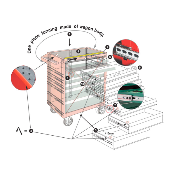 A key highlight is the inclusion of electroplated aluminum handles, designed not only for strength and comfort, but also to resist corrosion in humid or dusty conditions. Inside, an internal locking system safeguards your most valuable equipment perfect for mobile technicians or shared workspaces. This model is built with ±2mm structural accuracy, ensuring consistent alignment and long-term mechanical integrity. Combined with its compact footprint and large capacity, the 9915HQ offers efficient storage without taking up excessive space making it ideal for tool rooms, automotive bays, or factory environments. Every detail has been engineered to deliver safe mobility, secure storage, and maximum productivity. Start building your professional workshop setup by checking out our [Storage & Toolboxes] and [Tool sets] collections.